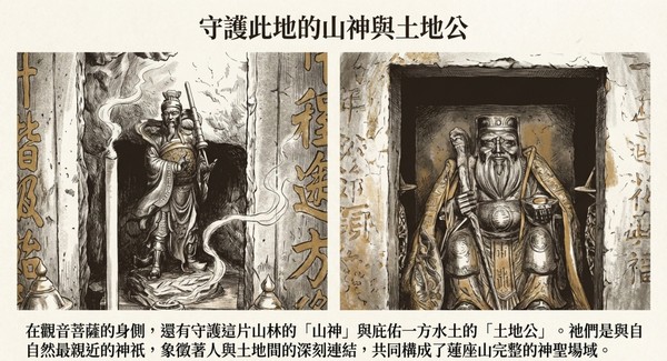 在觀音菩薩的身側,還有守護這片山林的「山神」與庇佑一方水土的「土地公」。祂們是與自 自然最親近的神祇,象徵著人與土地間的深刻連結,共同構成了蓮座山完整的神聖場域