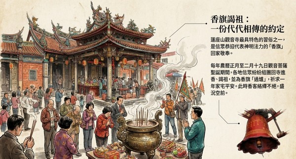 蓮座山觀音寺最具特色的習俗之一, 是信眾恭迎代表神明法力的「香旗」 回家敬奉。
