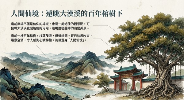 廟前廣場不僅是信仰的場域,也是一處絕佳的觀景點。可 俯瞰大漢溪寬闊蜿蜒的河階,遠眺層巒疊的山巒美景。