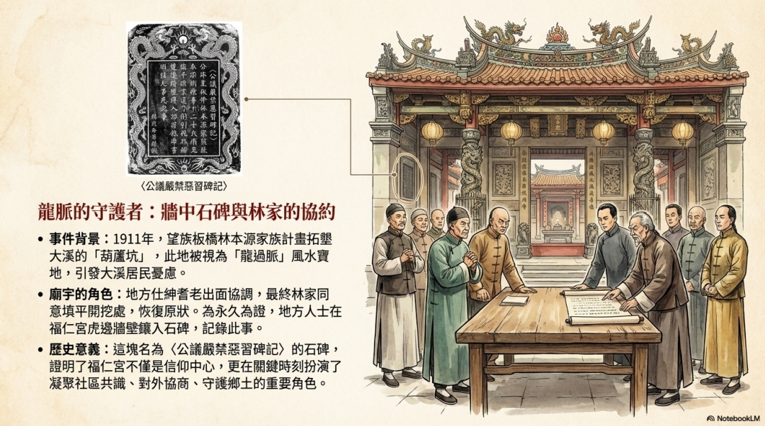 廟宇的角色:地方仕紳耆老出面協調,最終林家同 意填平開挖處,恢復原狀。為永久為證,地方人士在 福仁宮虎邊牆壁鑲入石碑,記錄此事。