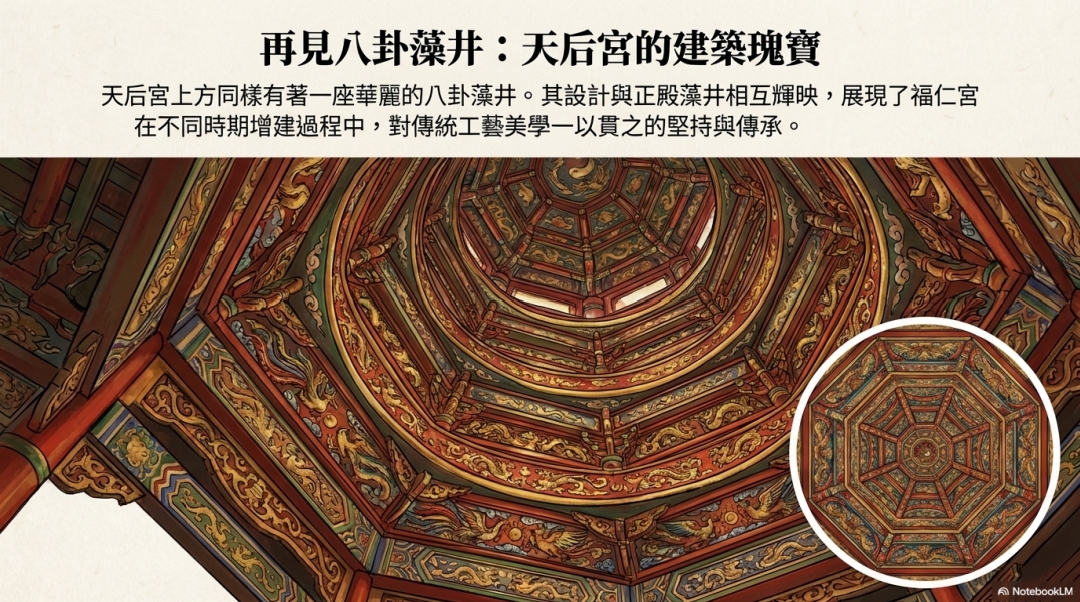 天后宮上方同樣有著一座華麗的八卦藻井。其設計與正殿藻井相互輝映,展現了福仁宮 在不同時期增建過程中,對傳統工藝美學一以貫之的堅持與傳承。