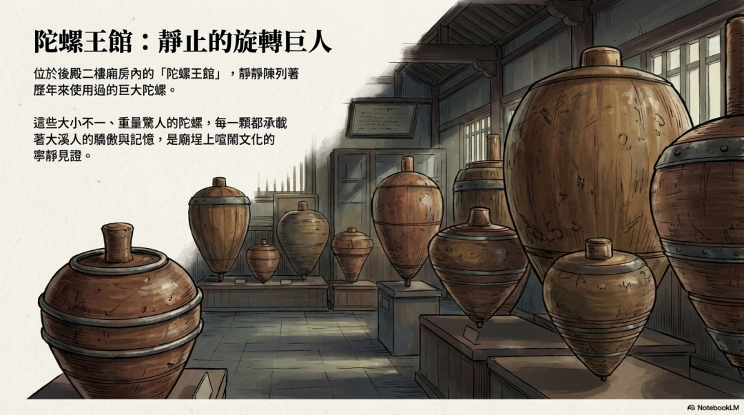 位於後殿二樓廂房內的「陀螺王館」,靜靜陳列著 歷年來使用過的巨大陀螺。