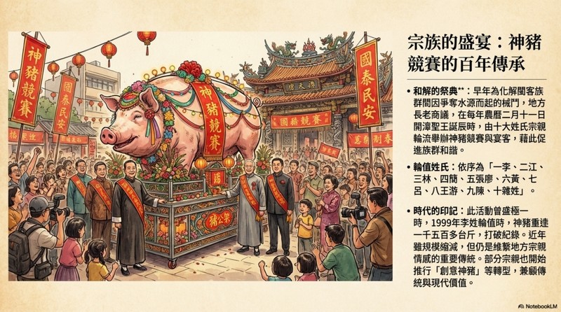 ·時代的印記:此活動曾感極一時,1999年李姓輪值時,神豬重達 一千五百多台斤,打破紀錄。近年 雖規模縮減,但仍是維繫地方宗親 情感的重要傳統。部分宗親也開始 推行「創意神豬」等轉型,兼顧傳 統與現代價值。
