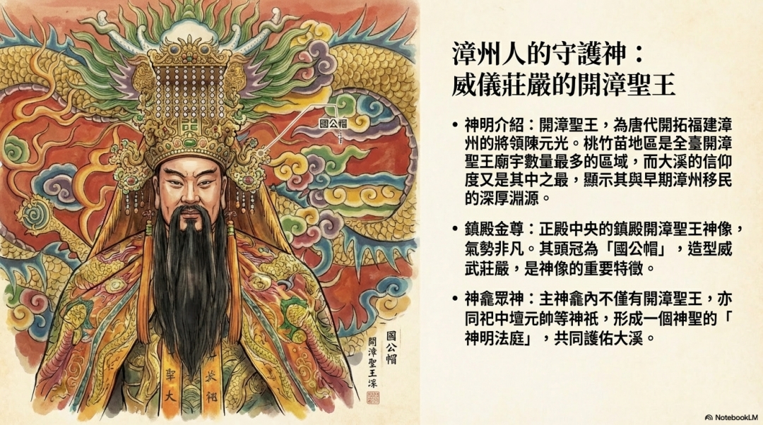 ·神明介紹:開漳聖王,為唐代開拓福建漳州的將領陳元光。桃竹苗地區是全臺開漳聖王廟宇數量最多的區域,而大溪的信仰 度又是其中之最,顯示其與早期漳州移民 的深厚淵源。