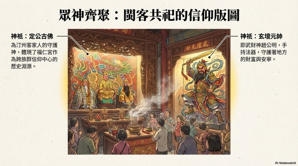 神龕眾神:主神龕內不僅有開漳聖王,亦 同祀中壇元帥等神祇,形成一個神聖的「 神明法庭」,共同護佑大溪。