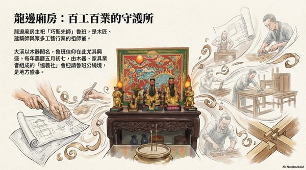 龍邊廂房主祀「巧聖先師」魯班,是木匠、建築師與眾多工藝行業的祖師爺。