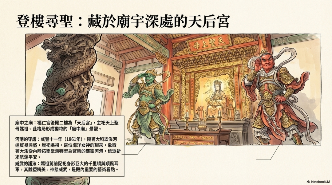 廟中之廟:福仁宮後殿二樓為「天后宮」,主祀天上聖 母媽祖。此格局形成獨特的「廟中廟」景觀。