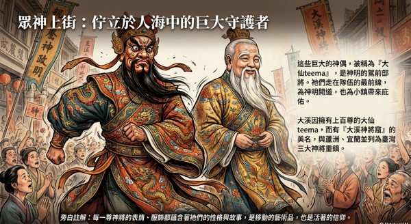 大溪因擁有上百尊的大仙 teema,而有『大溪神將窟』的 美名,與蘆洲、宜蘭並列為臺灣 三大神將重鎮。