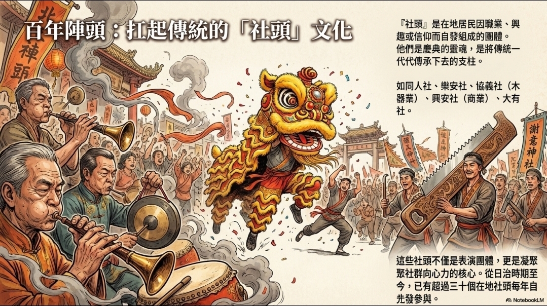 這些社頭不僅是表演團體,更是凝聚 聚社群向心力的核心。從日治時期至 今,已有超過三十個在地社頭每年自 先發參與。