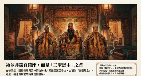 在普濟堂,關聖帝君與另外兩位神祇共同接受萬民香火,合稱 這是一種源自鸞堂的特殊信仰體系。