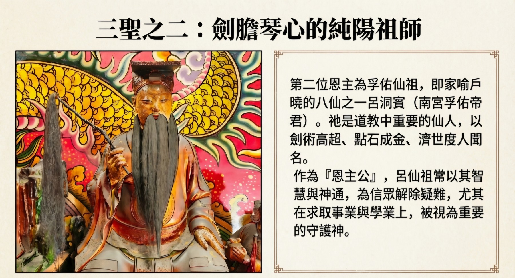 作為『恩主公』,呂仙祖常以其智 慧與神通,為信眾解除疑難,尤其 在求取事業與學業上,被視為重要 的守護神。