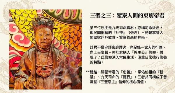 **總結:關聖帝君的『忠義』、孚佑仙祖的『智 慧』、九天司命的『德行』,三者共同構成了普 濟堂『三聖恩主』信仰的核心價值。