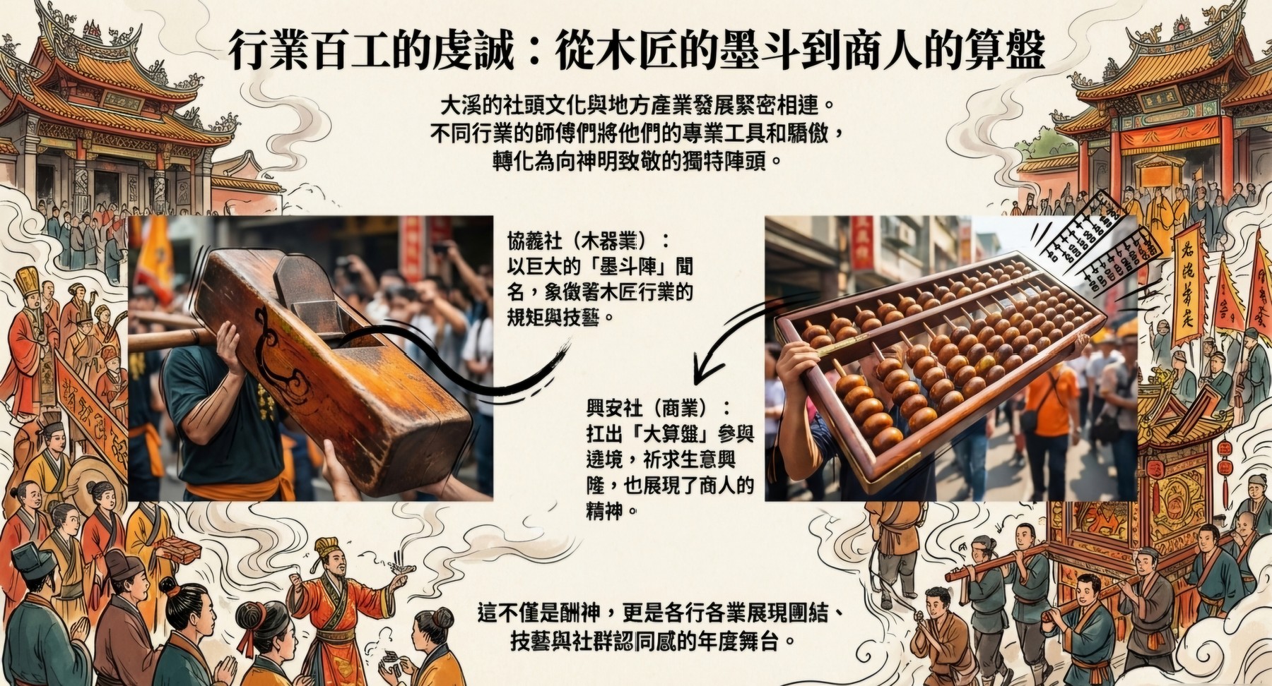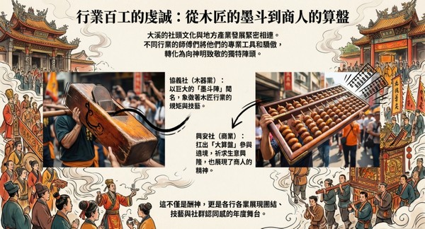 大溪的社頭文化與地方產業發展緊密相連。 不同行業的師傅們將他們的專業工具和驕傲, 轉化為向神明致敬的獨特陣頭。