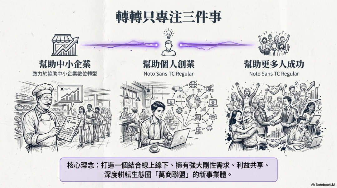 核心理念:打造一個結合線上線下、擁有強大剛性需求、利益 深度耕耘生態圈「萬商聯盟」的新事業體。