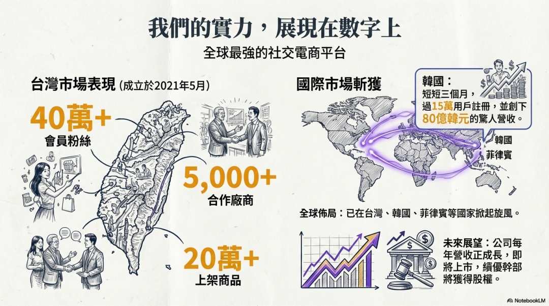 未來展望:公司每 年營收正成長,即 將上市,績優幹部 將獲得股權。20萬