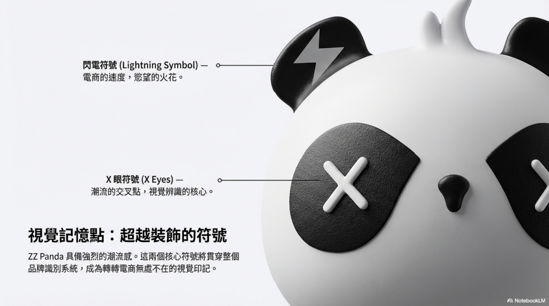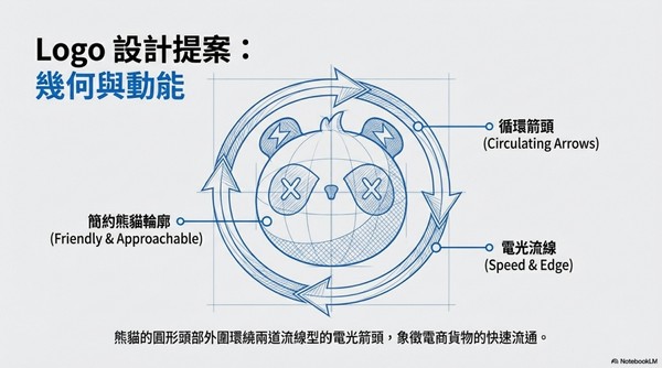 熊貓的圓形頭部外圍環繞兩道流線型的電光箭頭,象徵電商貨物的快速流通。