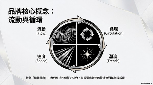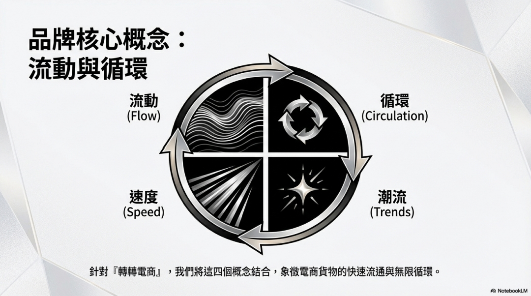 針對『轉轉電商』,我們將這四個概念結合,象徵電商貨物的快速流通與無限循環。