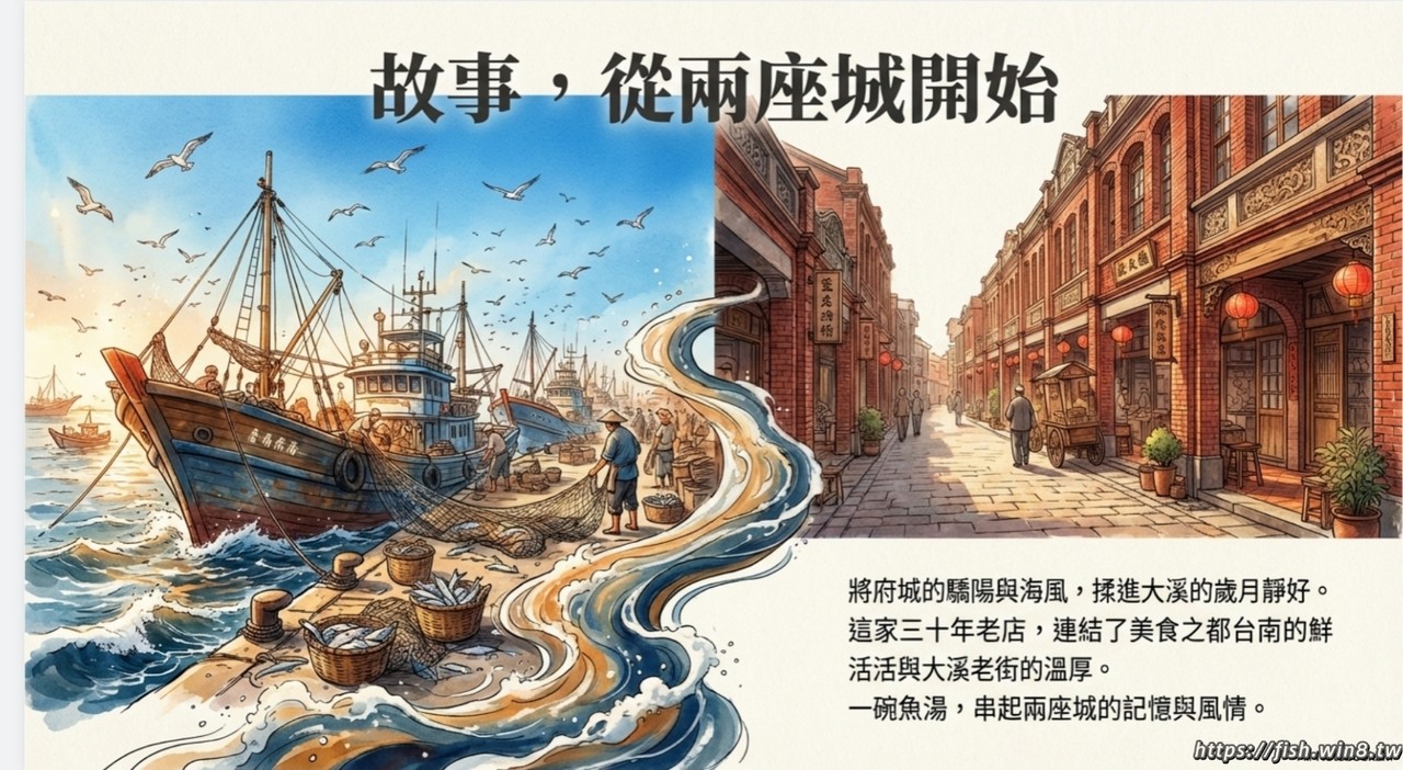 將府城的驕陽與海風,揉進大溪的歲月靜好。 這家三十年老店,連結了美食之都台南的鮮 活活與大溪老街的溫厚。一碗魚湯,串起兩座城的記憶與風情。