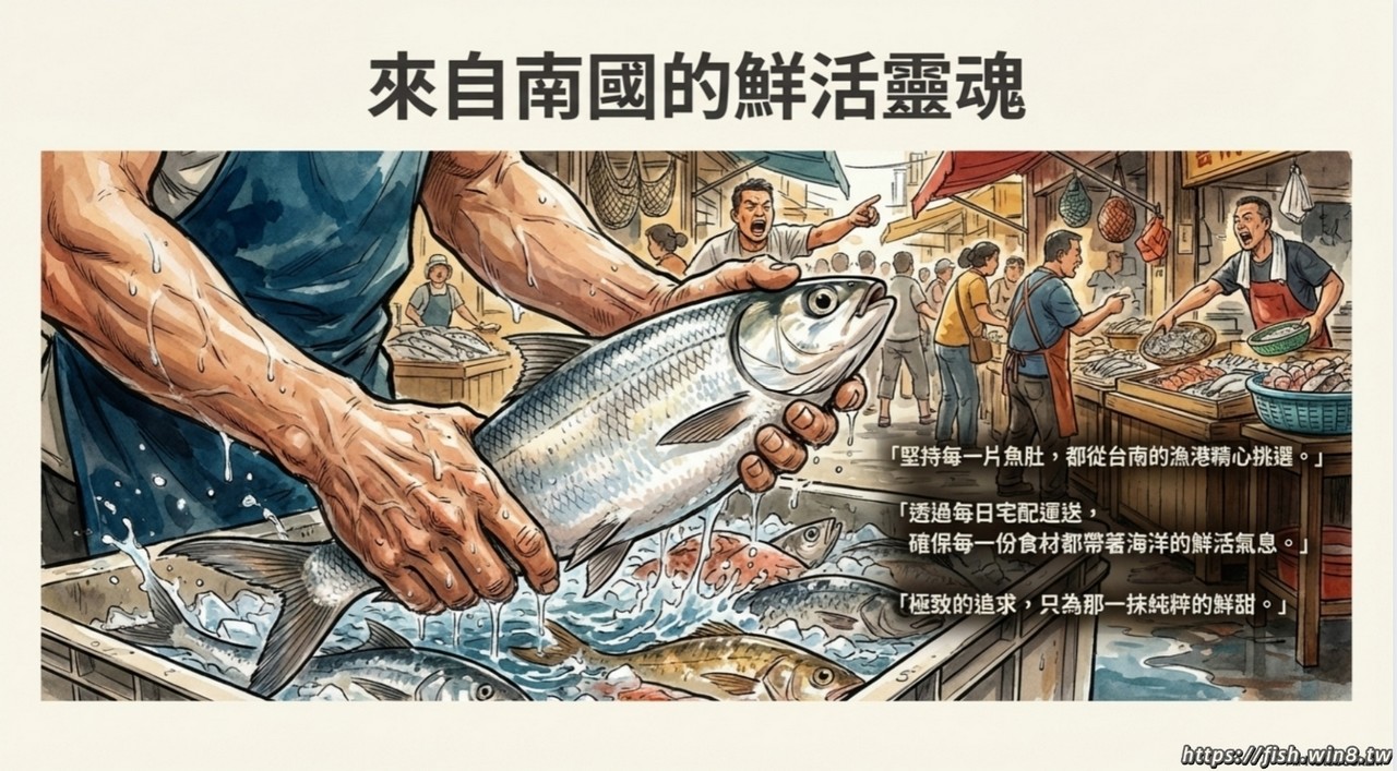 堅持每一片魚肚,都從台南的漁港精心挑選「透過每日宅配運送,確保每一份食材都帶著海洋的鮮活氣息。」「極致的追求,只為那一抹純粹的鮮甜。」