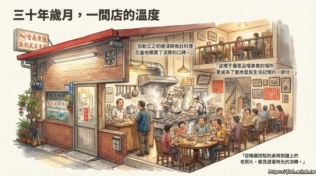自創立之初便深耕魚肚料理 在當地積累了深厚的口碑。」「這裡不僅是品嚐美食的場所,更成「從略顯斑駁的桌椅到牆上的 老照片,都見證著時光的流轉。」為了當地居民生活記憶的一部分。」
