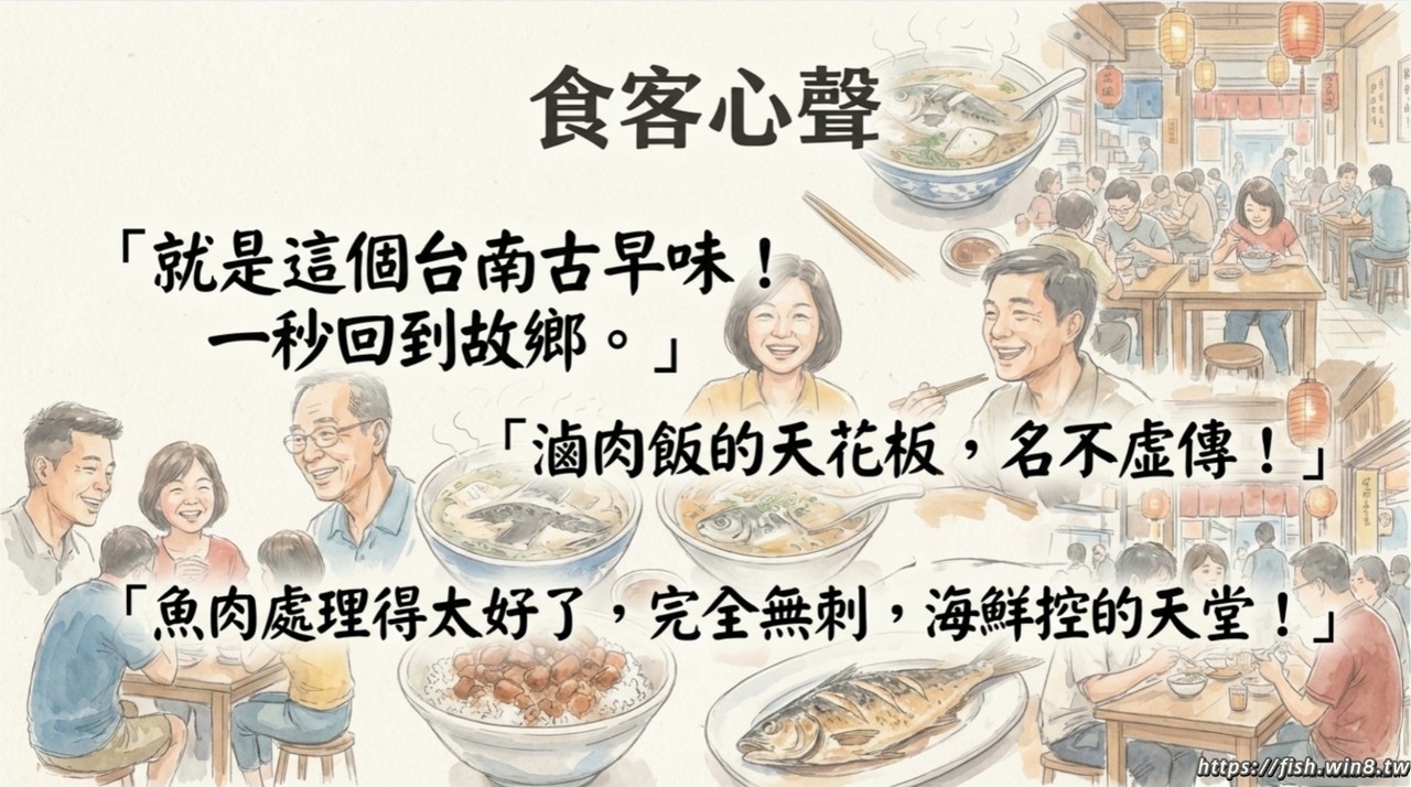 「就是這個台南古早味! 一秒回到故鄉。」「滷肉飯的天花板,名不虛傳!」「魚肉處理得太好了,完全無刺,海鮮控的天堂!」