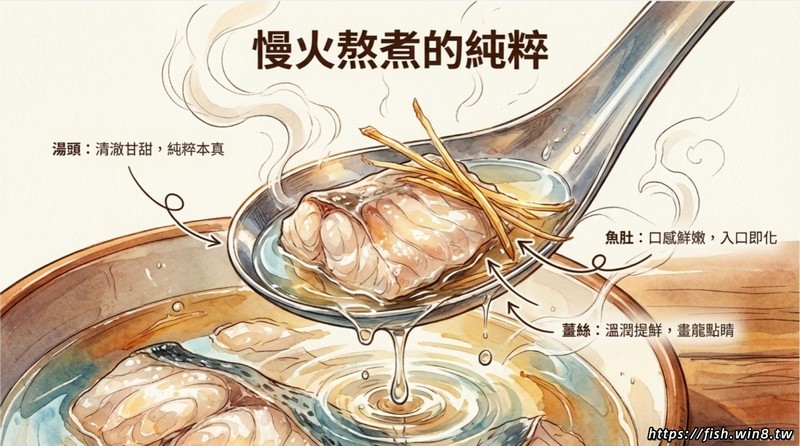 湯頭:清澈甘甜,純粹本,真魚肚:口感鮮嫩,入口即化。薑絲:溫潤提鮮,畫龍點睛