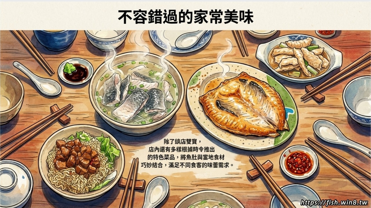 店家最為人津津樂道的招牌,莫過於其聞名遐邇的「無刺虱目魚肚」。為了讓顧客能夠毫無負擔地盡情享用魚肉的鮮美,廚師團隊在處理魚肉時格外用心,確保魚肚完全無刺。其中,「乾煎魚肚」更是許多食客的必點推薦,魚皮煎至金黃酥脆,魚肉則保持著恰到好處的軟嫩口感,每一口都是對台南風味的完美詮釋。